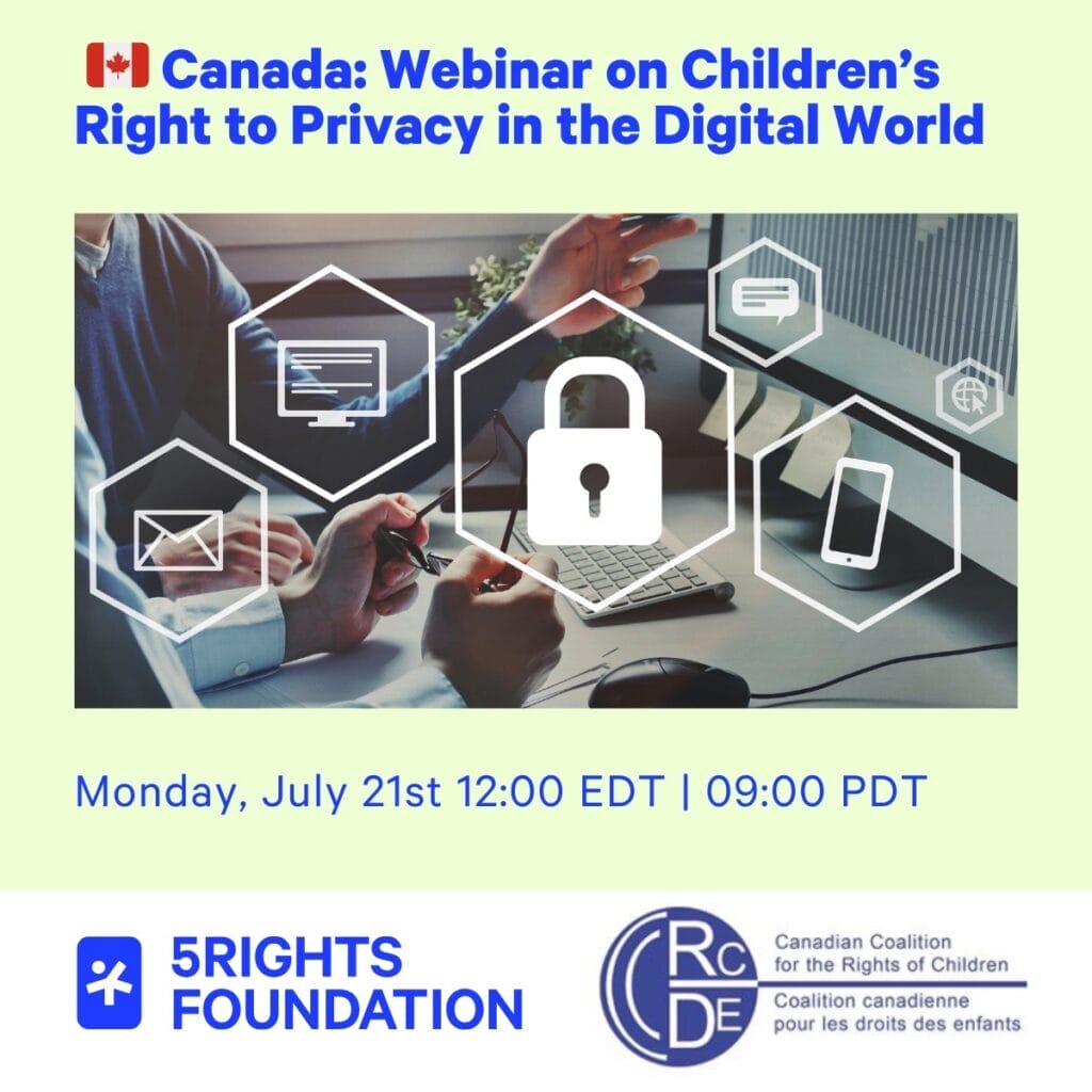 The Canadian Coalition for the Rights of Children (CCRC) and the 5Rights Foundation invite you to a discussion on children’s right to privacy in the digital world on Monday 21 July at 12:00 EDT | 09:00 PDT.