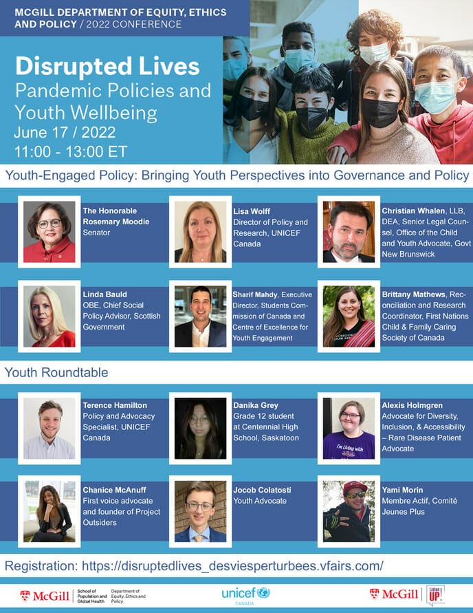 The McGill Department of Equity Ethics and Policy, UNICEF Canada, and the ListenUP! for Youth Wellbeing initiative invite you to the final session of our DISRUPTED LIVES: Pandemic Policies for Youth Wellbeing conference. Panelists will share their experiences developing and using strategies such as child and youth impact assessments, youth commissions and other youth accountability mechanisms. The discussion primarily focuses on the Canadian context but will also bring in some international best practice, with Linda Bauld, Chief Social Policy Advisory with the Scottish Government, joining us to speak to their government’s experience using both a youth commission and child and youth impact assessments in the development of their pandemic policies. The event ends with a moderated Youth Reflections panel bringing together a group of young people from across Canada to share their final thoughts on the conference and key recommendations for youth-engaged policy.